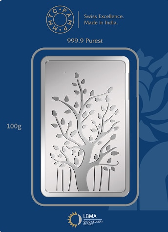 100 Gram MMTC Silver Bar – Banyan Tree Design This 100 gm MMTC-PAMP silver bar (999 purity) is a masterpiece of purity and craftsmanship. Featuring the Banyan Tree, a revered symbol of wisdom, stability, and prosperity, it reflects both cultural heritage and timeless value. Certified and securely packaged, this silver bar is perfect for serious investors, festive gifting, or as a prestigious collectible. With its elegant design and assured quality, the 100 gm Banyan Tree Silver Bar stands as a true emblem of trust and wealth.