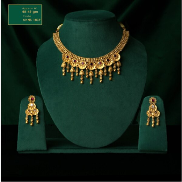 ✨ Description: Gold Antique Half Necklace Set Step into a world where tradition whispers through every curve of gold. This Antique Half Necklace Set is a tribute to timeless artistry — a delicate symphony of heritage and elegance. Crafted in lustrous 22kt gold, the necklace features intricate motifs inspired by royal temple jewelry, with floral accents and vintage textures that echo centuries of craftsmanship. The half-length design gracefully frames the neckline, making it ideal for pairing with sarees, lehengas, or fusion wear. Complemented by matching earrings, each piece is adorned with subtle antique polish, lending it a warm, heirloom-like glow. Whether worn for a wedding, festive celebration, or a grand evening affair, this set promises to be the centerpiece of your ensemble — a story told in gold.